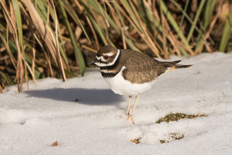 As we walked around the lake, Pied-billed Grebes and Hooded Mergansers frolicked in the water. A Tricolored Heron, Great Blue Heron and Snowy Egret sat along the bushy edges. Another nice surprise was a Little Blue Heron feeding along the icy shore. In the horse pasture across the street, six Killdeer hopped along in the snow.