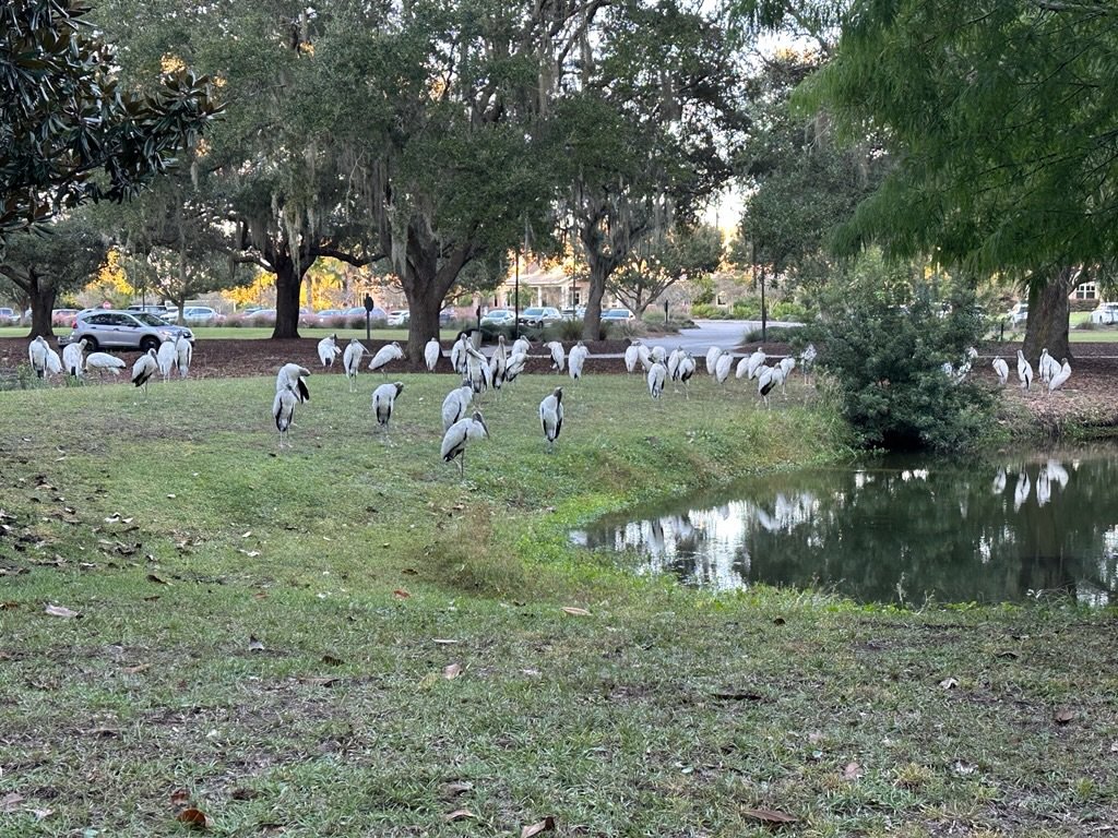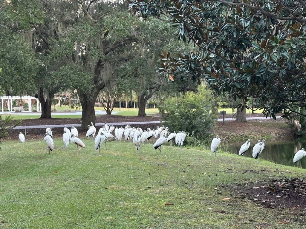 If you’ve driven past the Lake House lately, you’ve probably noticed a large number of big, white birds gathering on the banks of the little lagoon across the street. These are Wood Storks, one of several species of stork, and the only stork native to North America.