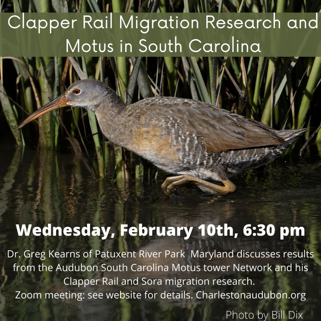 Dr Greg Kearns has been studying Clapper Rails and Sora for decades along the Patuxent River in Maryland through the Maryland-National Capital Park Planning Commission. With the new expansion of Motus Wildlife Tracking Towers in South Carolina through the work of the US Fish and Wildlife Service, SC DNR, and Audubon South Carolina and the Audubon chapter and bird club network, individuals wearing these tags have been detected along our coast, giving us a new look at the migration habits of these secretive marsh birds.