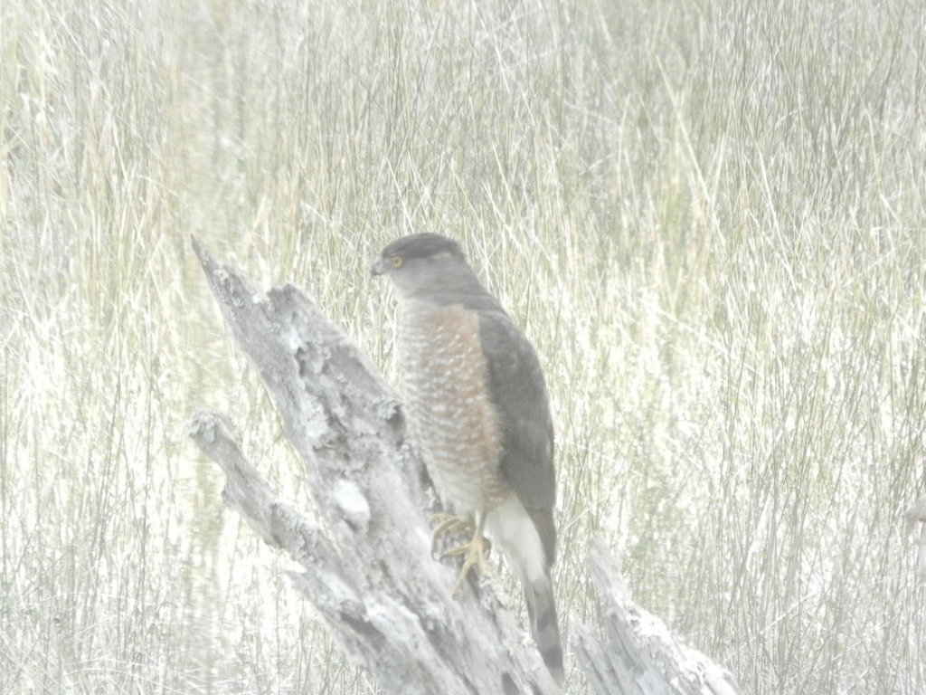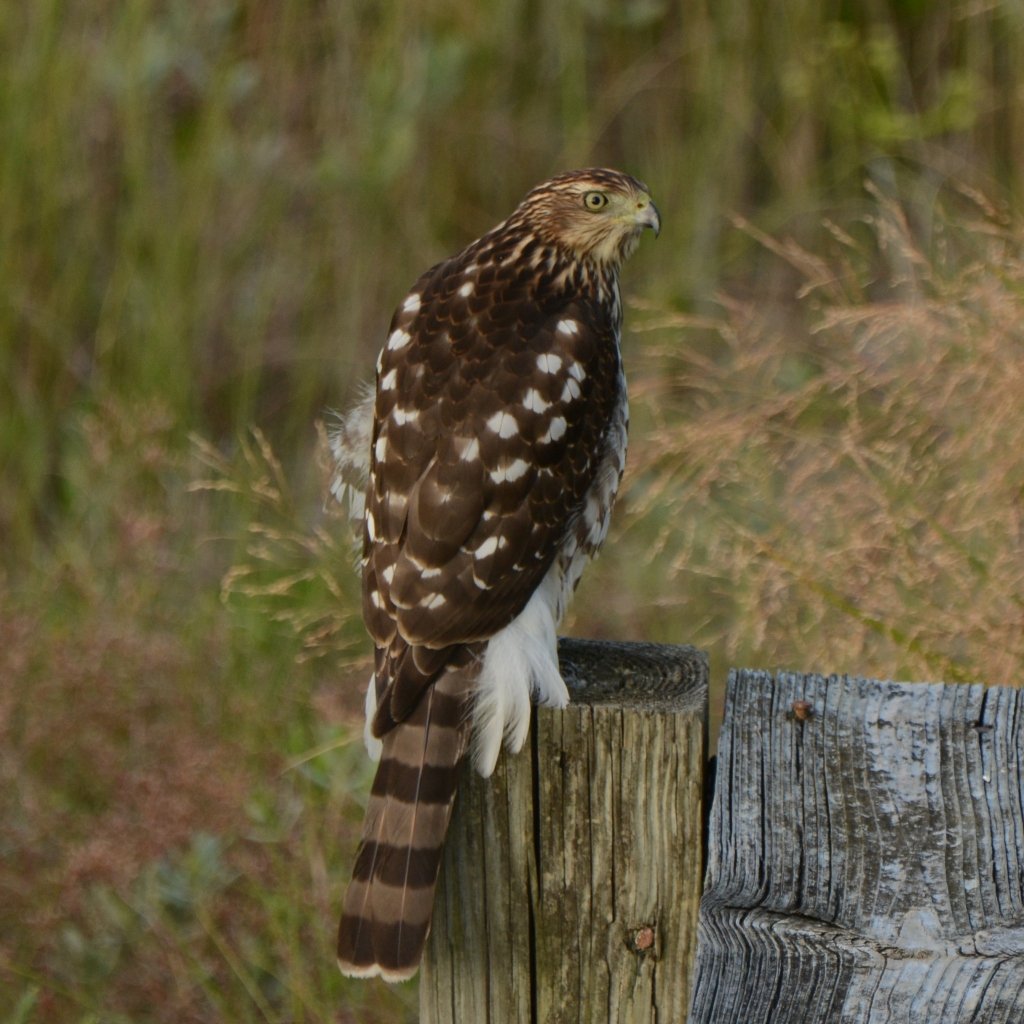 Favorite hunting sites for Cooper’s are the many bird feeders which birders display — and he is not interested in the seed therein. My usual observation finds them sitting, very erectly, on roof tops from which there is a great view of potential prey below. Last Spring there was a juvenile which seemed to make his home around the Island House.