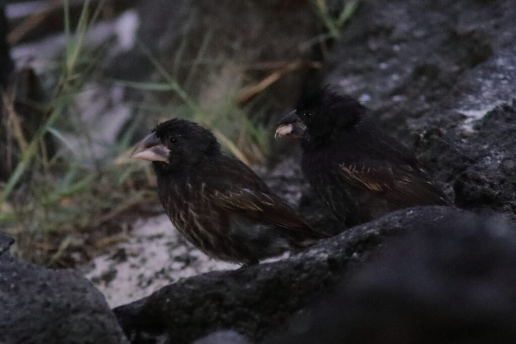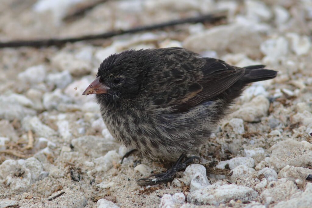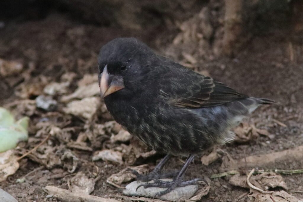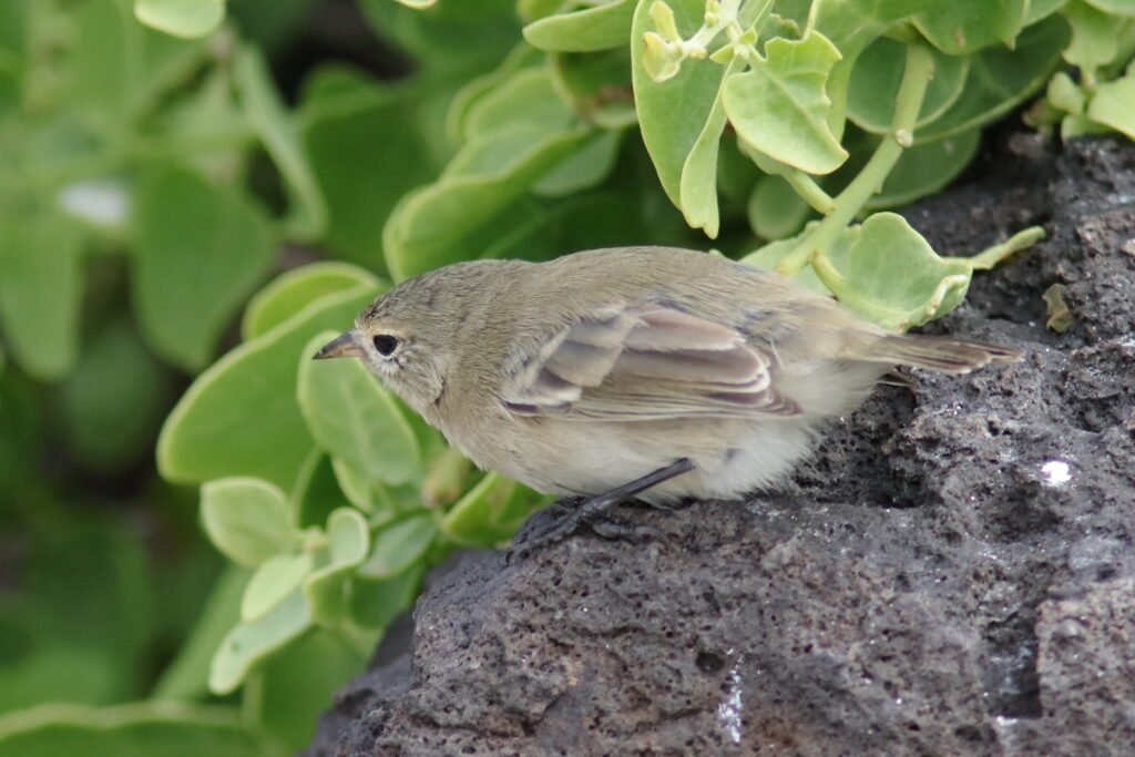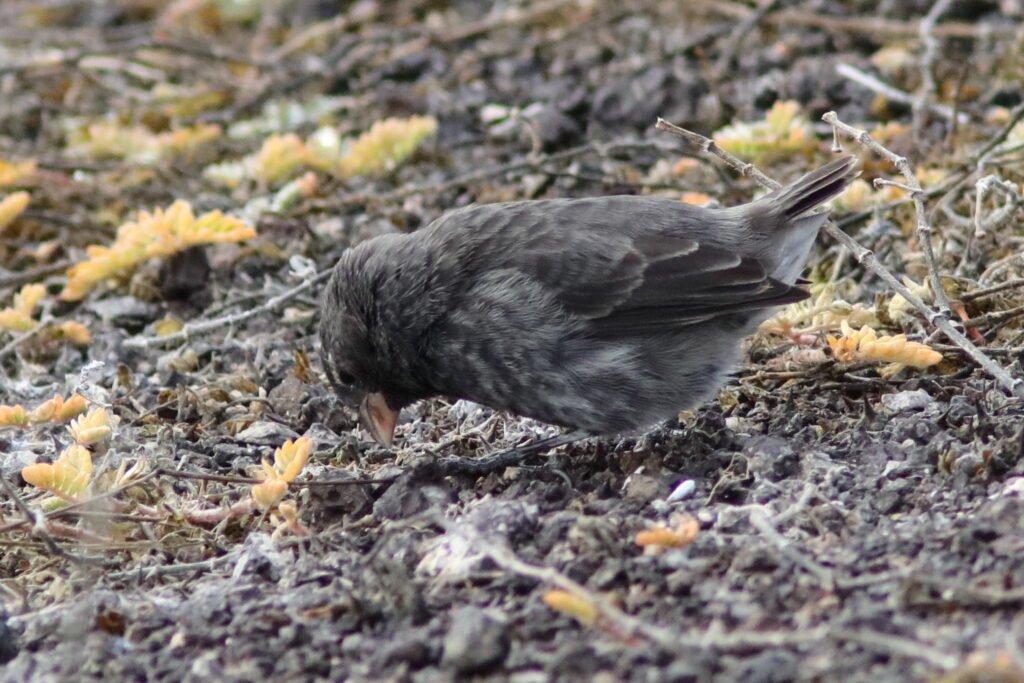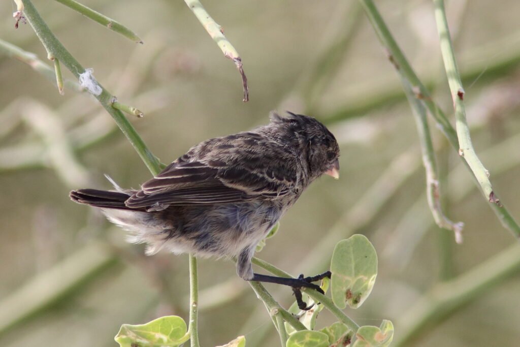 All the images below are Small Gound Finches. These common birds appear on most islands and adapt to a wide array of habitats and conditions much like a House Sparrow. As a small bird with a “small” bill, they feed on the smaller seeds which can be abundant during the El Niño years (high rainfall). They suffer in the La Niña years of low rainfall as the seeds of the plants that survived were larger and harder.