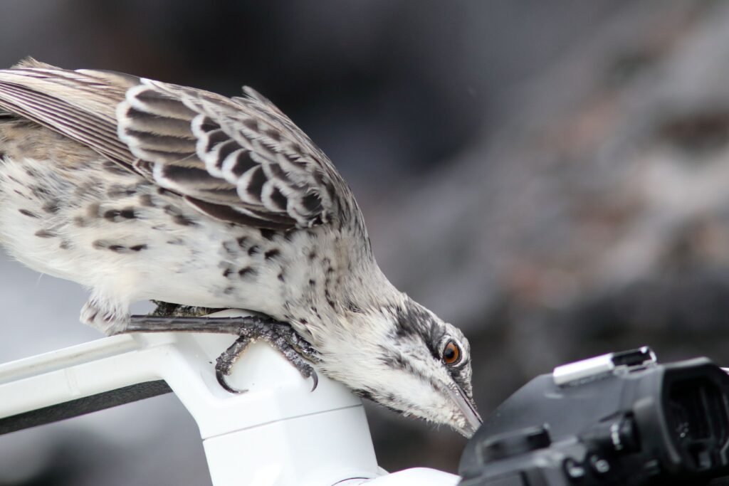 Many of the animals on the Galapagos Islands never developed a fear of humans. We learned that the Española Mockingbirds we not only fearless around humans, hanging around under our feet. They were downright friendly, letting photographers get so close the big lenses would not work. Plus, they were very curious.