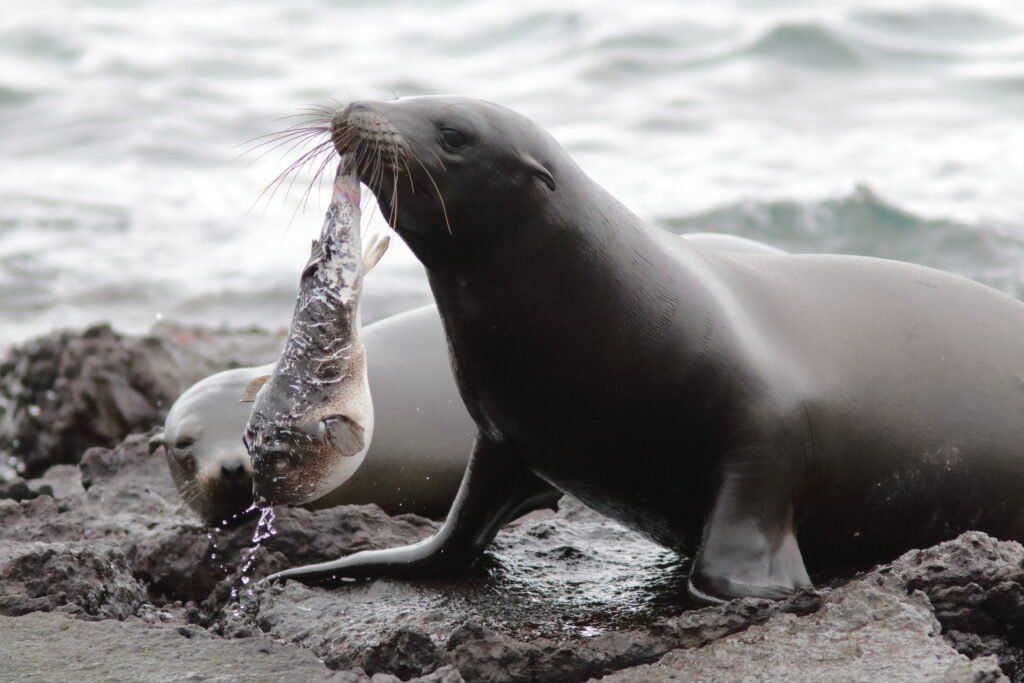 Once we found a mother that had just given birth. She worked her way up onto the rocks, the baby whining and crying the whole time until given the opportunity to suckle. Turn up the volume