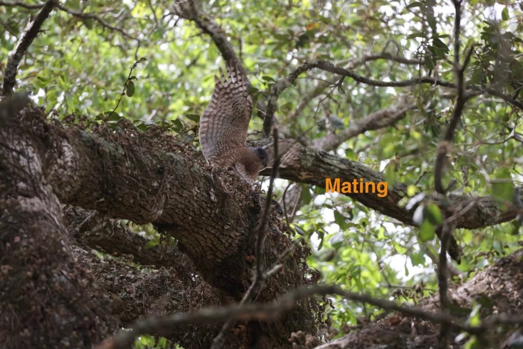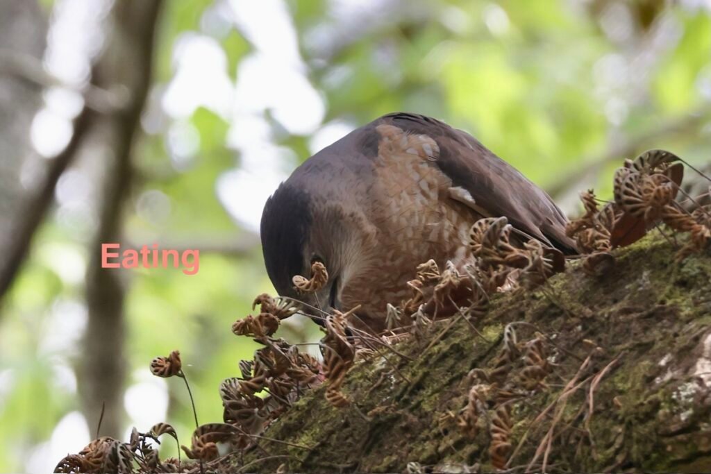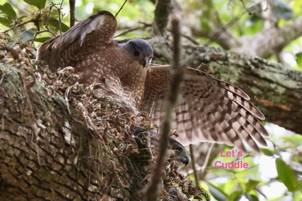 For five days, we would see at least one in the tree, calling and appearing to eat something hidden by the ferns. On the 6th day, there was a loud caking and kiking as the male called and flapped his wings perhaps the bird equivalent of thumping his chest. Naturally, I grabbed my camera, little realizing that I was photographing “hawk love”.