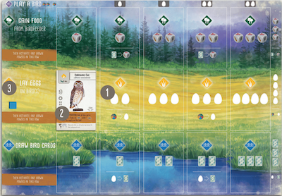 - Play a bird from your hand on one of the three habitats, paying the required food and egg fees