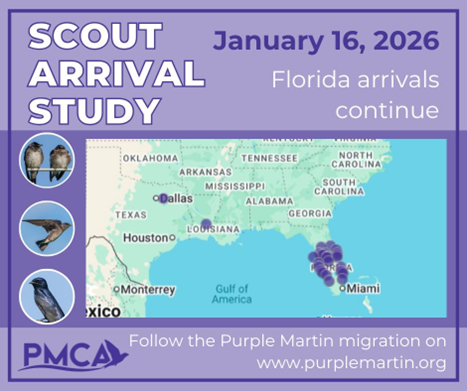 Scout-Arrival Study: The Scout-Arrival Study documents the first arriving Purple Martins at nesting sites. Landlords throughout the breeding range submit their first returning adult and sub-adult to the PMCA. This information is used to track the spring migration progress of Purple Martins.