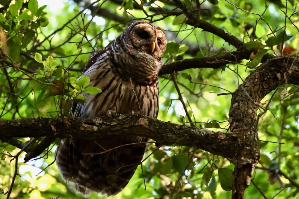 It was on a bike ride a couple of years ago, near Camp St Christopher that he spotted something up in the trees that I completely missed. For once I didn’t have my camera with me, just my binoculars and cell phone, but I was able to get a good look at what he found. A Barred Owl! The owl was sitting on a branch of a large tree keeping a close eye on his surroundings, as well as us standing across the street. We watched him through the binoculars and even shared the binoculars with a couple of other walkers who passed by and wondered what we were staring at!
