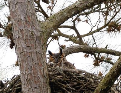Female Great Horned Owls are larger than males. In courtship, males perform flight displays and also feed the female. They typically use old nests of other large birds such as hawks, eagles, crows, herons and ospreys. Nests are usually 20-60′ above ground and they add little or no nest material to the existing nest. In fact, currently on Seabrook Island, a Great Horned Owl is actively nesting in what is believed to be a former Osprey nest.