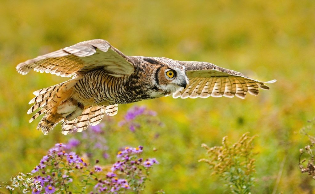 Found throughout North America and much of South America, this large owl is an aggressive and powerful hunter. Prey includes hawks, ospreys, falcons and other owls. They also eat rabbits, snakes, rodents, frogs, and even skunks. Its large eyes have many rods for night vision and pupils that open widely in the dark. While its eyes don’t move, this owl can swivel its head more than 180 degrees and look in any direction. Great Horned owls have acute hearing, assisted by facial disc feathers that direct sound waves to its ears. Short, wide wings allow maneuverability through the forest and exceptionally soft feathers allow for silent flight. They clench their prey with talons so strong it takes 28 pounds of force to open them, a grip so deadly it can easily sever the spine of large prey.