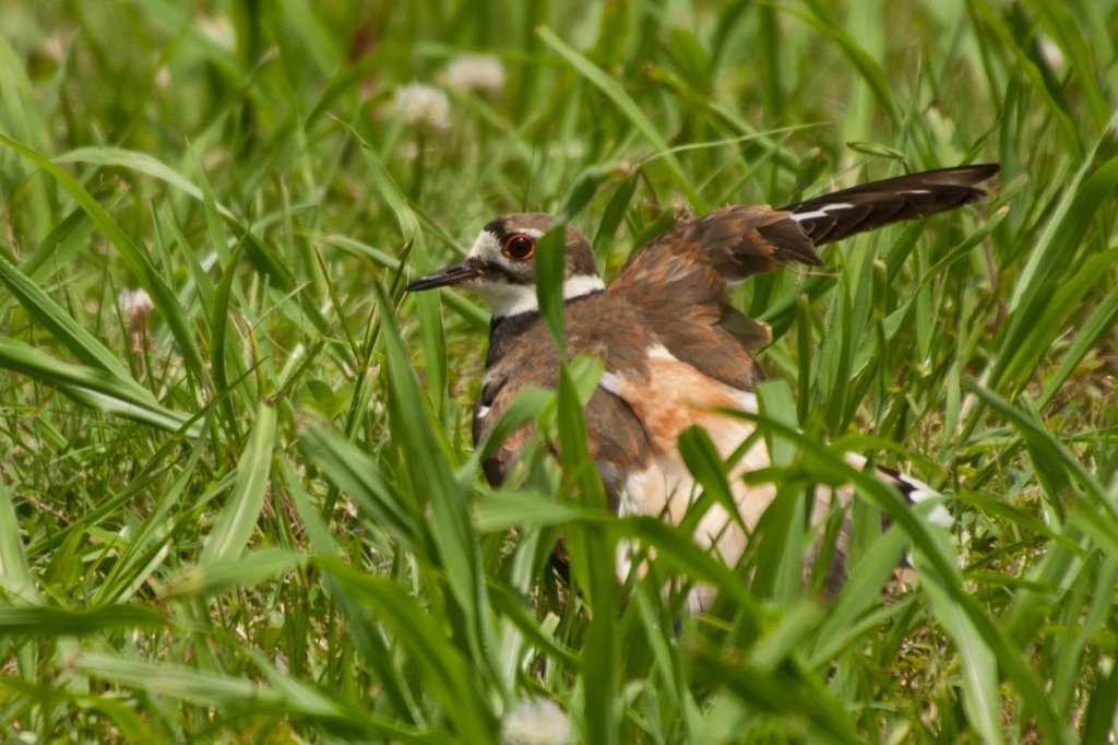 The Killdeer is easy to recognize with their double black neckband (that look like necklaces), rusty rump and white belly. It has a slim shape with long wing and tail feathers. It also has a bright red eye ring and thin beak.