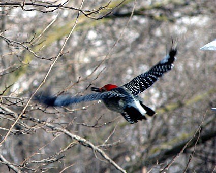 The Red-bellied Woodpecker is named for a small wash of reddish-orange feathers on the belly. Their back is narrowly barred black and white. It has a red forehead, cap and nape around pale cheeks. The female’s red is confined to the nape. Juveniles may lack red on the head. In flight there is a white rump with dark outer tail feathers. Their strikingly barred backs and gleaming red caps make them an unforgettable sight – just resist the temptation to call them Red-headed Woodpeckers, a somewhat rarer species that’s mostly black on the back with big white wing patches.