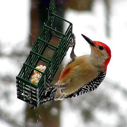 Omnivorous, Red-bellied Woodpeckers feed on insects, acorns, fruit seeds, and nuts. In the south they may favor oranges. They may also usurp sapsucker wells. They hoard nuts, fruit, and insects. They may occasionally feed on the ground. They will come to a feeder for suet and sunflower seeds.  A Red-bellied Woodpecker can stick out its tongue nearly 2 inches past the end of its beak. The tip is barbed and the bird’s spit is sticky, making it easier to snatch prey from deep crevices. Males have longer, wider-tipped tongues than females, possibly allowing a breeding pair to forage in slightly different places on their territory and maximize their use of available food.