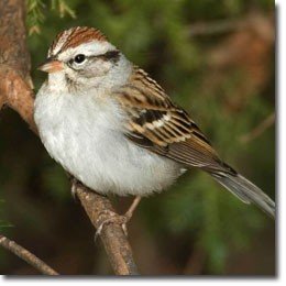 The Chipping Sparrow has a rust red colored cap and a black line going through his eye. The adult lacks the streaked chest of some sparrows. You might also notice that he is one of the smaller of these four sparrows. They will eat many kinds of birdseed and will come to feeders for black oil sunflower seed and white millet.