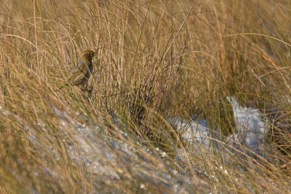 The sun was shining nicely off of the snow but it was a brisk 20 degrees when we began our search in the SIPOA / Club Maintenance Area and the Water Treatment Facility. 33 species were seen in this area including four Ruddy Duck, 13 Bufflehead and one Ring-necked Duck. The surprise of this stop was seeing two olive green birds with a yellow chest. Who would think on a snowy January morning we would see Painted Bunting? The day also ended with a brief return to this area where 13 species were observed including the expected Hooded Merganser which had joined the other ducks. This time, the surprise was an American Woodcock in the tree line between the SIPOA / Club Maintenance Area and the Community Garden. Both visits included Brown Thrasher and Eastern Towhee scratching under a bush looking for bugs among the leaves and snow.