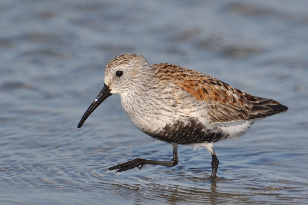 In addition to the ducks that we see on our lakes and ponds, we also have many shorebirds that enjoy their winters here and then head north as far as Alaska and the Hudson Bay in Canada. The Least Sandpiper is the smallest of the North American Sandpipers and is one of the smallest waders in the world. They are about 6” long and have a white underbelly and streaked brown and grey upper-parts with a slender straight dark bill. The Dunlin is also seen frequently on the beach in the winter where they forage for insects, larvae and small crustaceans in tidal pools by the sea. The Dunlins must hate the heat of summer as they migrate almost all the way to the northern polar cap in the summer. Among the gull family that head to cooler climes in the summer are the Bonaparte’s Gull and the Ring-Billed Gull. The Ring-billed Gull is fittingly named due to its black band located just behind the tip of his bill. The Bonaparte’s Gull was named after a French zoologist who was a nephew of Napoleon and is less common than the Ring-Billed Gull. It is one of the smallest gulls found in this area.