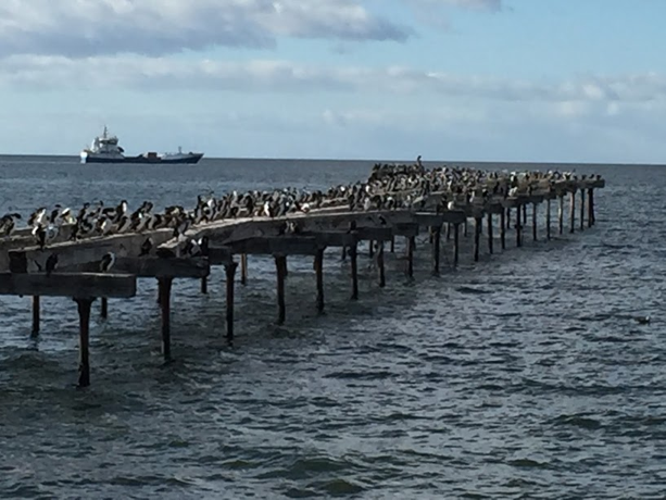 My favorites were the Imperial Cormorants, also called Imperial Shags, on the beach in Punta Arenas (see photos below). They look and waddle like miniature penguins, grouped in large colonies on the beach, but are much larger and more active than the cormorants we see on Seabrook. Some of their colonies can be quite large, as seen on the pier below.
