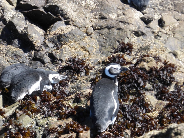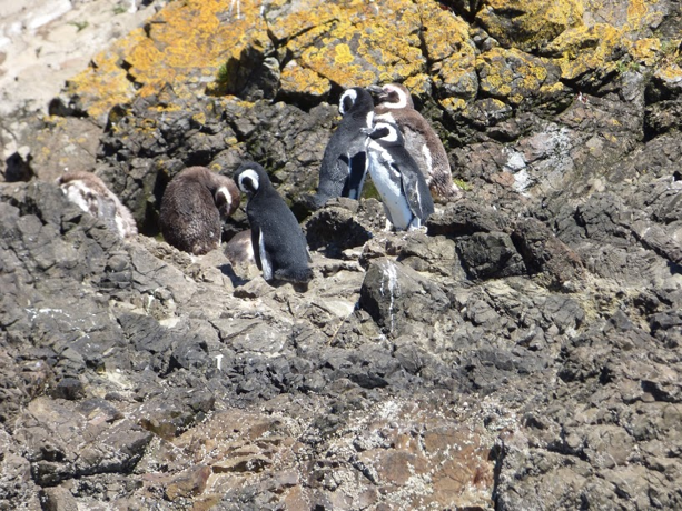 We had an opportunity to take a small boat on the Island of Chiloe to observe both Humboldt and Magellan Penguins sunning and feeding on the rocks on the islands. These rock islands are the only place where both Humboldt and Magellan Penguins cohabit-ate, which is a big deal considering that Humboldt Penguins are endangered. An interesting aside is that the penguins actually roost in the hills above the rocks, and then waddle down paths to the rocks to fish and sun. We caught glimpses of them coming down from the hills, but photos were a challenge, as we were on a small boat rocking around in the waves. Here are some photos which Diana took. Notice how well the penguins blend into the rocks – great camouflage!