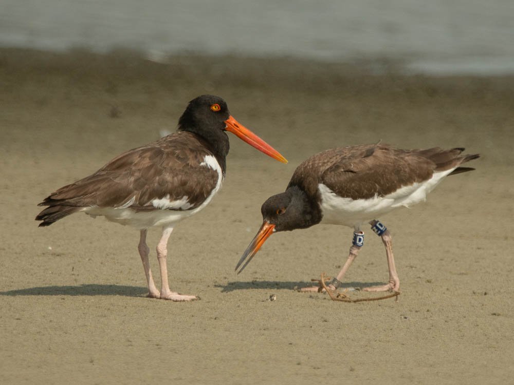 The striking American Oystercatchers are wonderful to see, especially a larger flock moving around from the point to the SCDNR nesting area. We were on the lookout for our old friend U5, and his mate and juvenile. The family treated me to a nice “through the lens encounter”. Mom and juvenile were together foraging, then each gave their little call. I heard the return call to my far left, and there’s U5 doing a magnificent flyby!